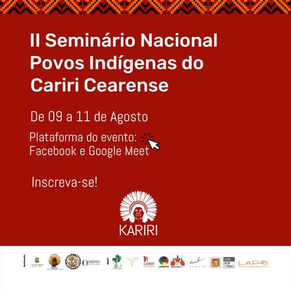 Será realizado entre os dias 9 e 11 de agosto (domingo a terça-feira) o II Seminário Nacional Povos Indígenas do Cariri Cearense. O evento online, que poderá ser acessado pelo Google Meet e pelo Facebook, é promovido pela Universidade Regional do Cariri (URCA) e a Associação dos Índios Cariri de Poço Dantas – Umari e tem como objetivo construir uma agenda propositiva para o fortalecimento do movimento indígena na região do Cariri e da troca de saberes indígenas com os saberes acadêmicos.